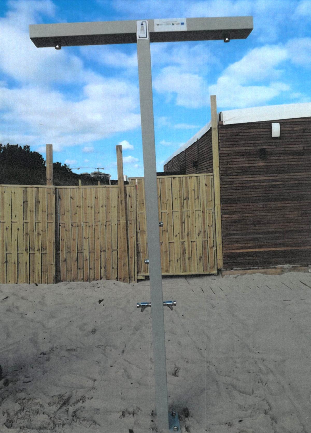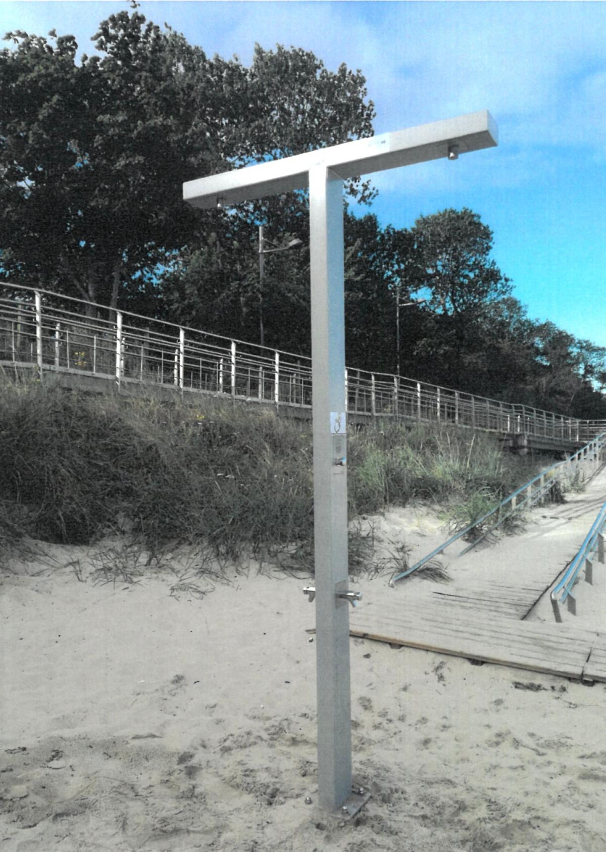 - montaż prysznica plażowego ze stali nierdzewnej posadowionego na prefabrykowanym fundamencie betonowym;