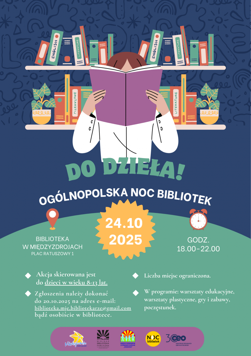 Miejska Biblioteka Publiczna w Międzyzdrojach serdecznie zaprasza do wzięcia udziału w Ogólnopolskiej akcji Noc Bibliotek pt. "Do dzieła!", która odbędzie się 24 października 2025 r. w godz. 18.00- 22.00 w międzyzdrojskiej bibliotece (Plac Ratuszowy 1).