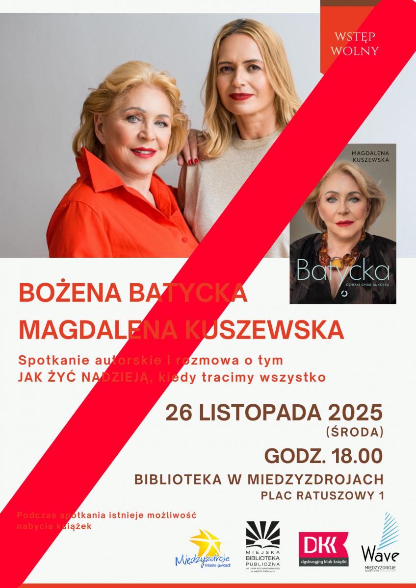 Informujemy, że z przyczyn od nas niezależnych spotkanie autorskie z Panią Bożeną Batycką i Panią Magdaleną Kuszewską, zaplanowane na 26 listopada 2025 r., zostało odwołane.