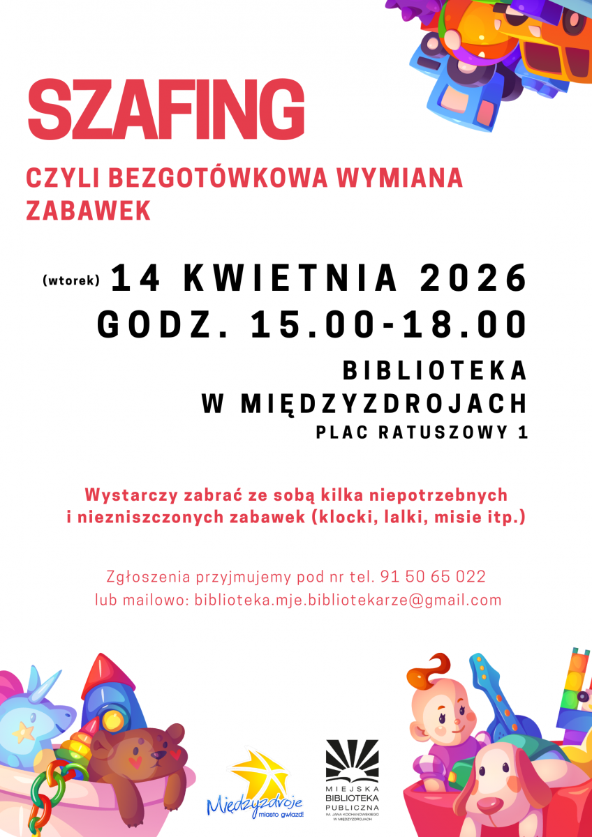 Miejska Biblioteka Publiczna w Międzyzdrojach zaprasza do wzięcia udziału w bezgotówkowej wymianie zabawek pt. „Szafing”. Akcja odbędzie się 14 kwietnia 2026 r. (wtorek) w godz. 15.00-18.00 w bibliotece (Plac Ratuszowy 1).