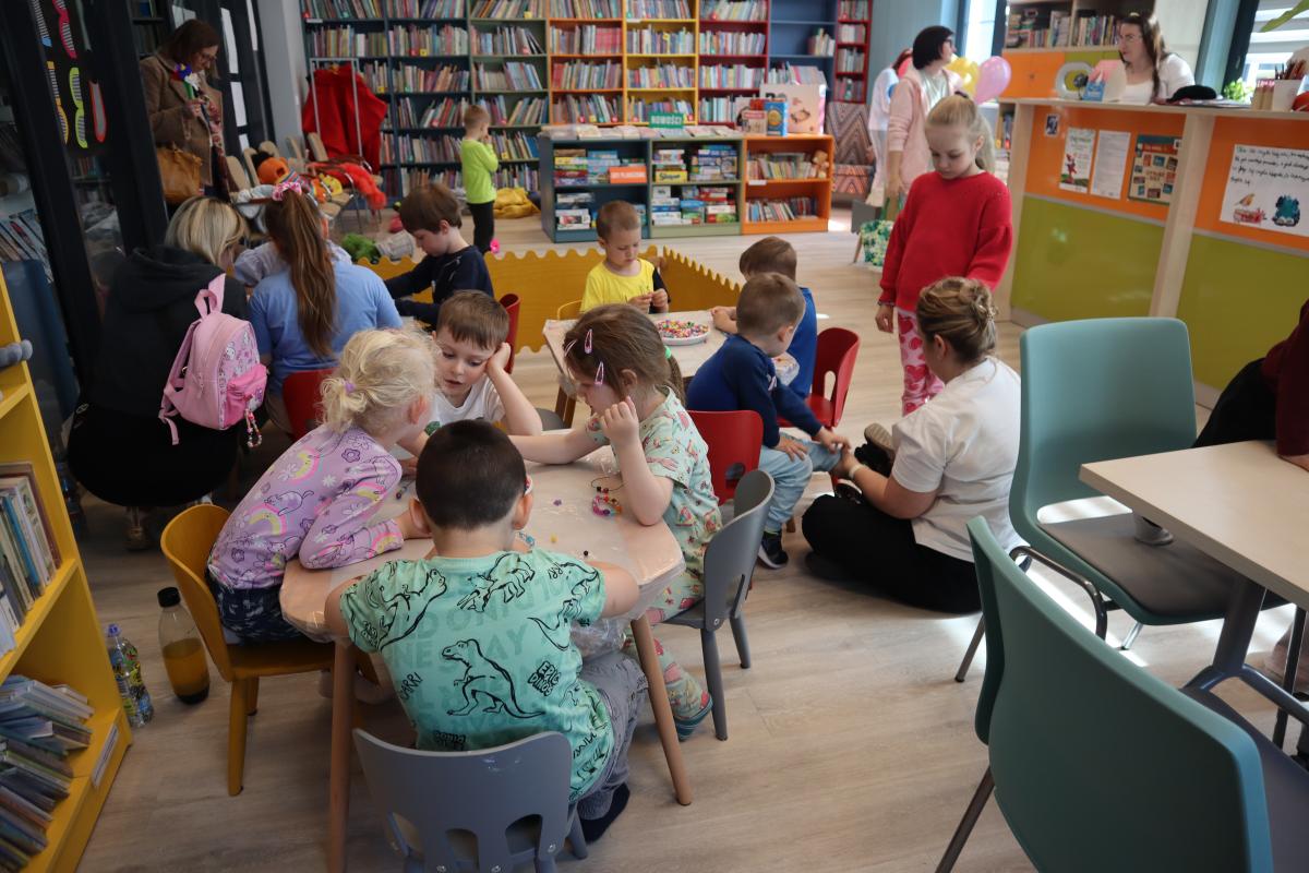 Na zakończenie zajęć, z okazji Ogólnopolskiego Tygodnia Bibliotek 2025, każde dziecko otrzymało balonik, a uczestnicy mogli wybrać parę kolczyków dla swoich mam jako upominek z okazji ich święta.
